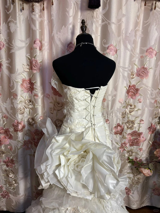 Princess White Satin Drop Shoulder Beaded Petal Skirt Floor-Length Wedding Dress P3069