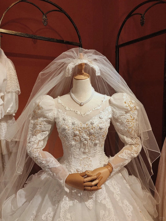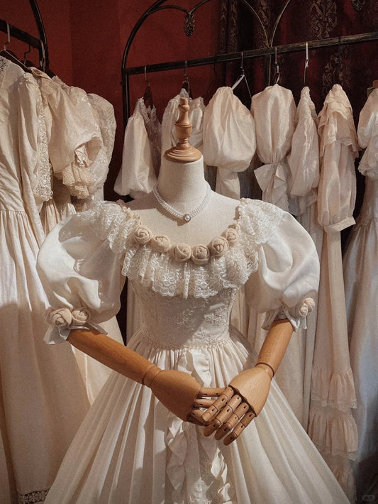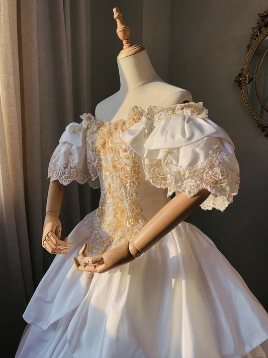 Retro Princess Off-shoulder Puff Sleeve Lace Cake Skirt Floor-length Wedding Dress P3064