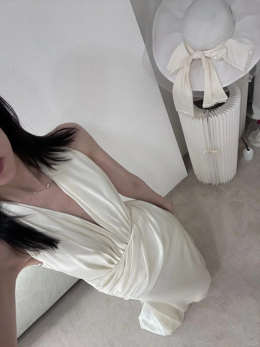 Simple White Satin Halter V-Neck Mermaid Wedding Dress P3084