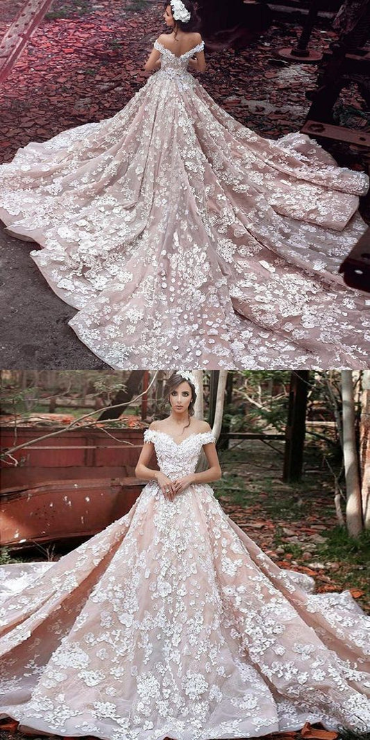 Luxurious Organza Off Shoulder Short Sleeves Wedding Dress with Lace,Cheap prom Gowns cg1847