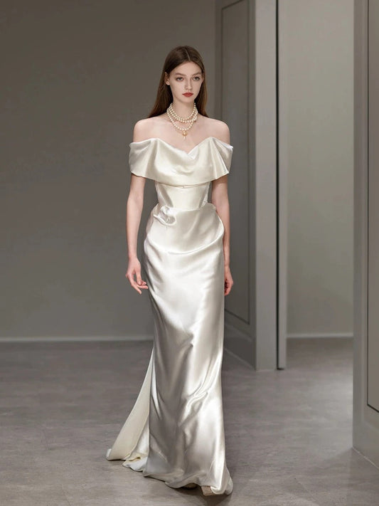Classy Elegant Mermaid Off The Shoulder White Short Sleeves Satin Wedding Dresses Brides Dress DP454