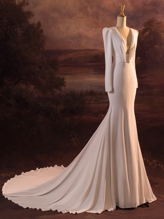 Vintage Wedding Dress Mermaid V Neck White Long Sleeves Satin Long Wedding Dresses Bridal Gowns Brides Gown DH407