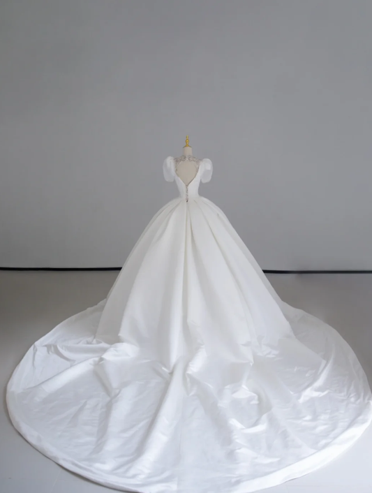 Timeless Ball Gown Scoop Short Sleeves Long Satin White Sweep Train Wedding Dresses Brides Dress DP507