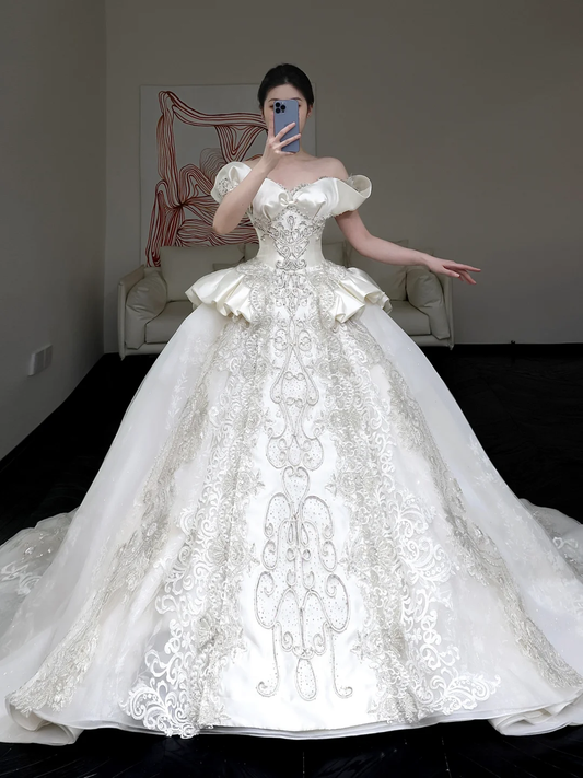 Timeless Bridal Gown Ball Gown Off The Shoulder Satin Long Wedding Dresses Bridal Gowns DP852