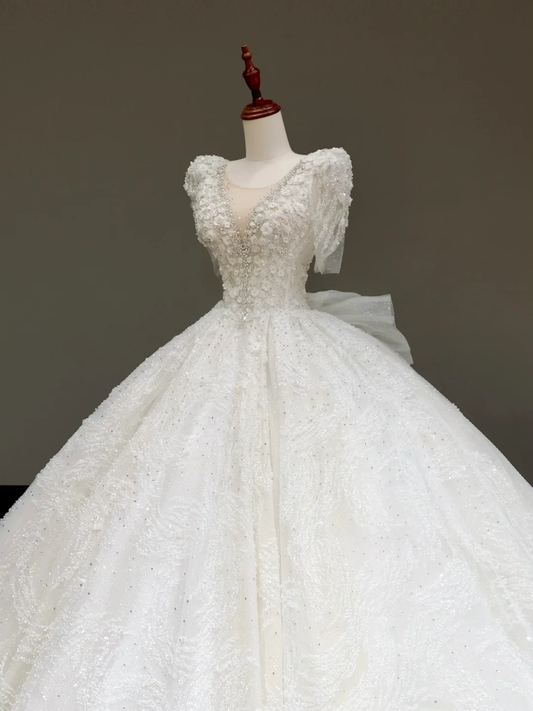 Classy Elegant Ball Gown Off The Shoulder Sequin White Short Sleeves Wedding Dress Brides Dress DP832