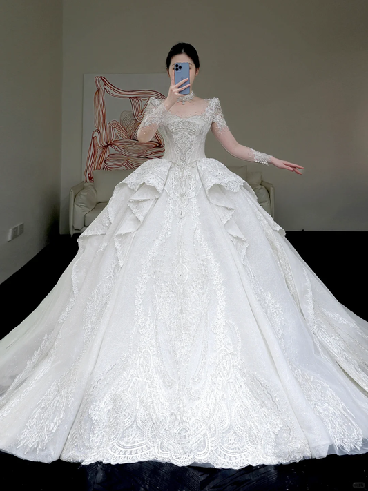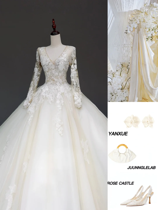 Unique Bridal Gown Ball Gown V Neckline Long Sleeves White Lace Wedding Dresses Bridal Gowns DP843