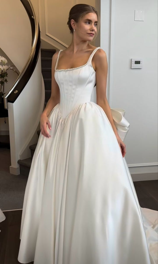 Classic Bridal Gown Ball Gown Square Neck Satin White Wedding Dresses Minimalist Bridal Gowns DP1194