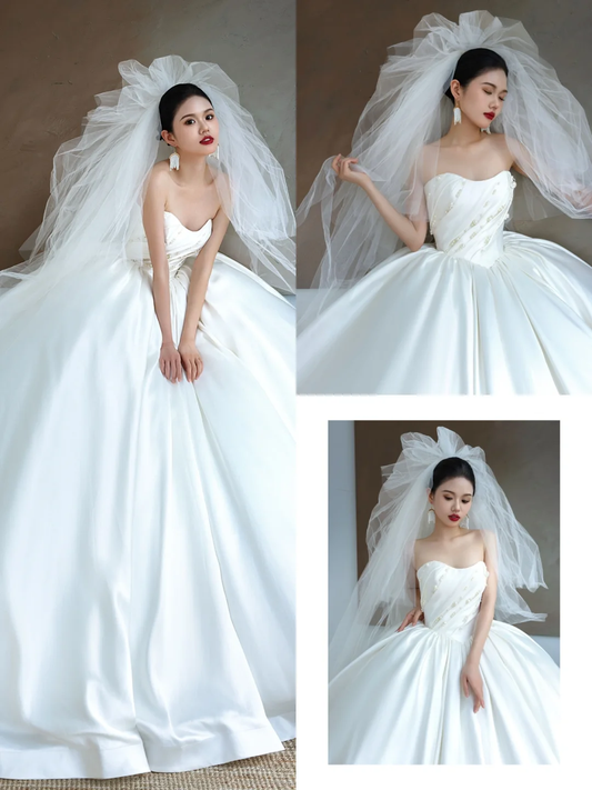 Classic Bridal Dress Ball Gown Strapless Satin White Wedding Dresses Minimalist Bridal Gowns DP1601
