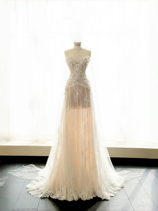 Simple Bridal Gown Ball Gown Strapless White Lace Floor Length Wedding Dresses Minimalist Bridal Gowns WD047