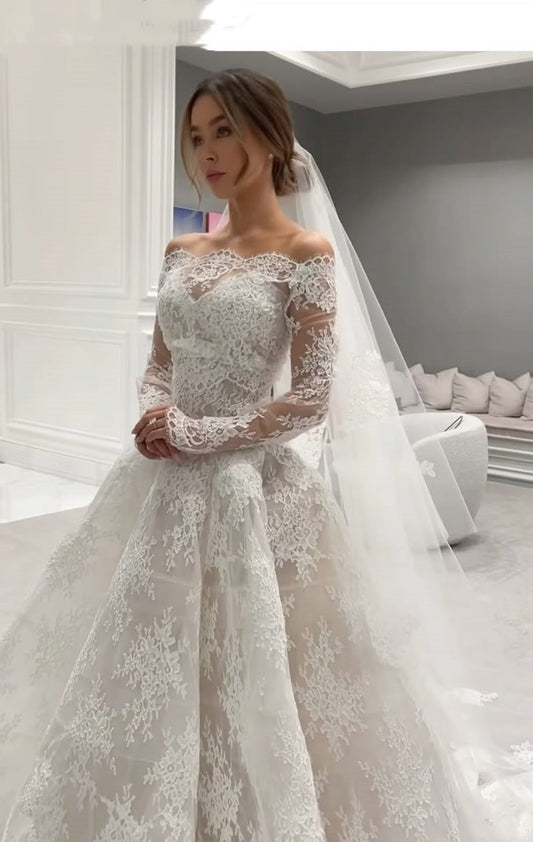 Romantic Bridal Gown Ball Gown Off The Shoulder White Lace Floor Length Long Sleeves Wedding Dresses Minimalist Bridal Gowns WD049