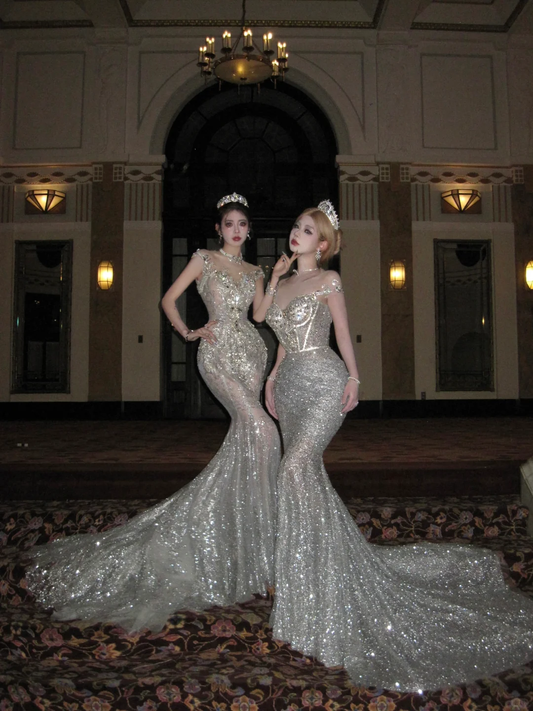 Sexy Wedding Dress Mermaid Sequin Beads Long Silver Wedding Dresses Bride Dress Bridal Gowns DP1865