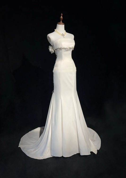 Modest Bridal Gown Mermaid Sweetheart Sleeveless Satin Long Ivory Wedding Dresses Elegant Bridal Gowns DH1130