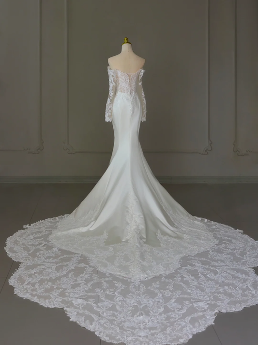 Modest Bridal Gown Mermaid Off The Shoulder White Long Sleeves Satin Lace Wedding Dresses Elegant Bridal Gowns DH1125