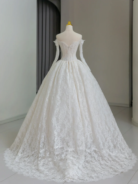 Unique Bridal Gown Ball Gown Off The Shoulder Lace Long Sleeves White 50s Wedding Dresses Vintage Bridal Gowns DH1137