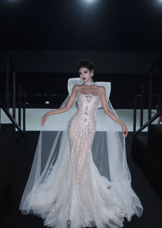 Rhinestone Exquisite Mermaid Spaghetti Strap Beaded Tulle Prom Dress Wedding Dress with Bow SH3639