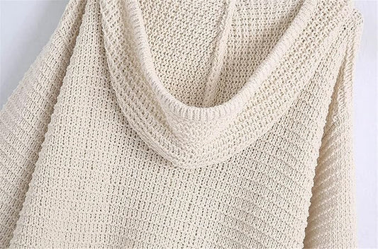 New white V-neck retro fashion long-sleeved hooded loose drawstring knitted hoodie pullover female casual sweater top 7281