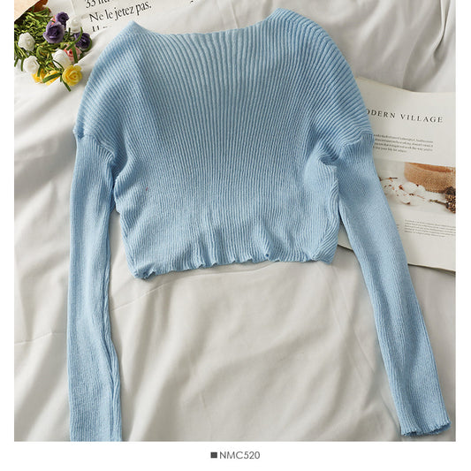 Solid color versatile low collar collarbone exposed long sleeve bottomed top 1813