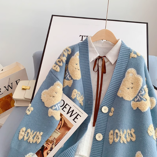 V-neck bear cardigan sweater loose knitted cardigan ED0191
