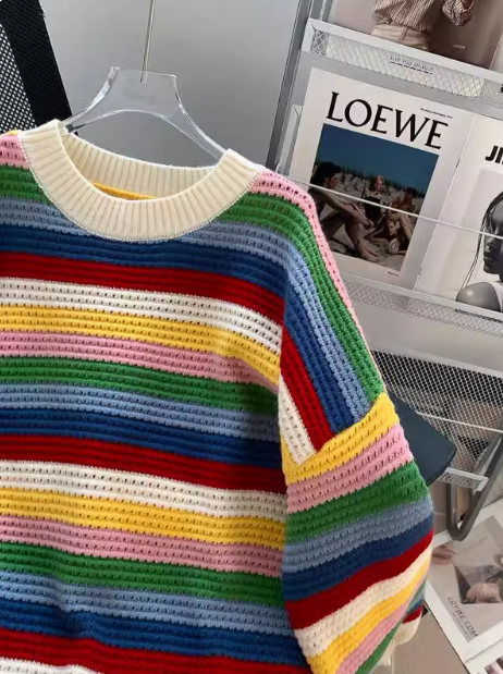 Rainbow Stripe Fringe Loose Crewneck Sweater ED0195