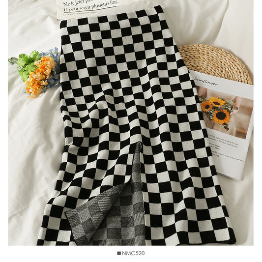 Korean Plaid elastic waist thin split knit one-step skirt 2526