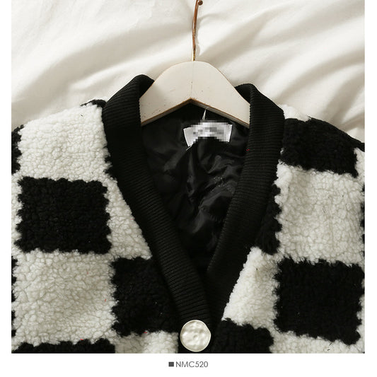 Contrast check medium length single breasted cotton thickened lamb wool coat 2121