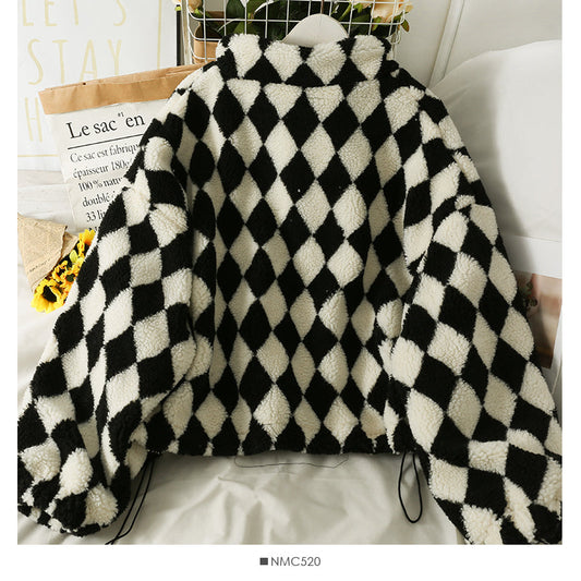 Diamond Plaid high neck bubble sleeve thickened jacket female drawstring lamb wool 2118