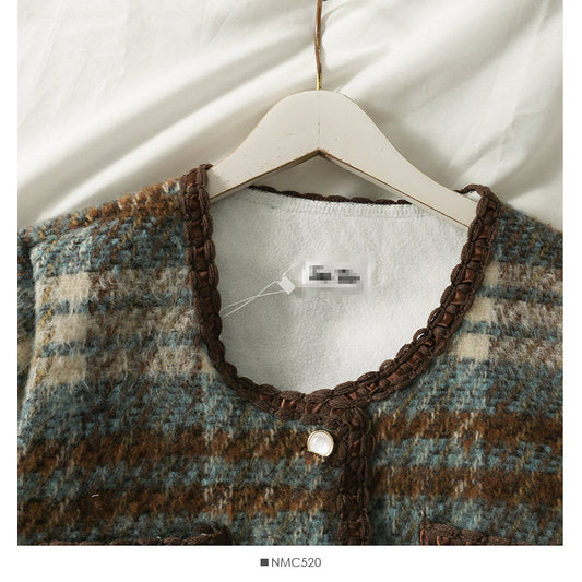 Hong Kong Style Vintage Plaid single breasted cardigan woolen jacket female 2124