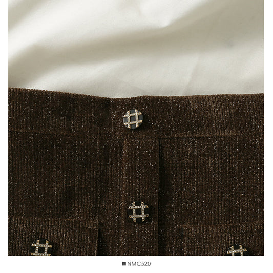 Hong Kong style retro bright silk vertical stripe buckle high waist slim A-line skirt 2588