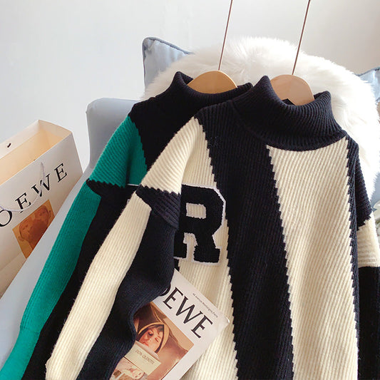 Contrast color turtleneck sweater lazy wind backing sweater top 5217