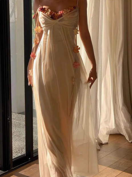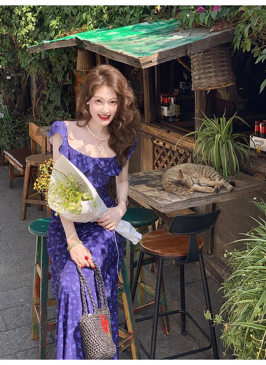 French Ruffle Satin Swing Neck Suspender Dress Fishtail Maxi Dress ED0278