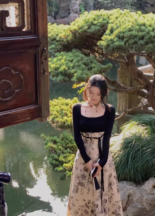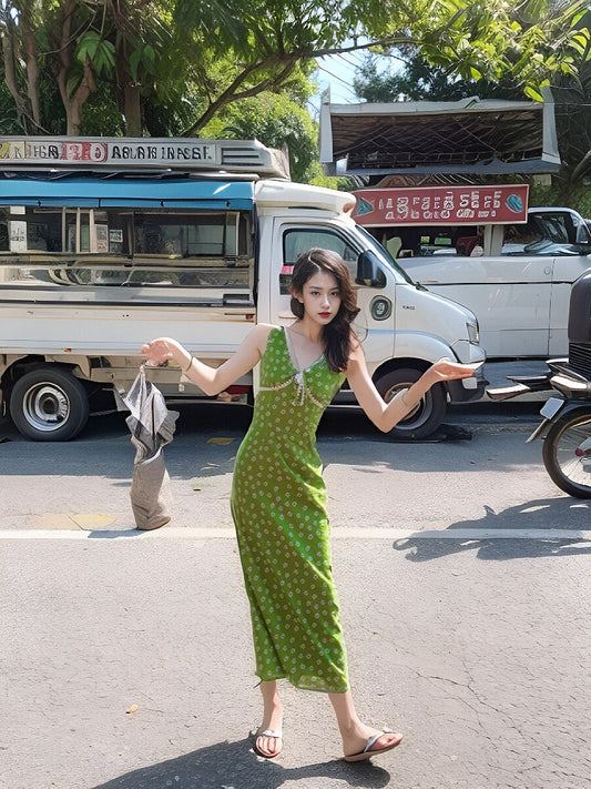 New Chinese bamboo print satin pleated waist suspender dress ED0360