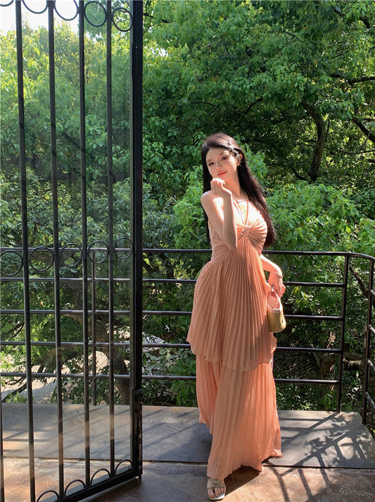 Brown A-line halter neck suspender V-neck backless dress ED0475