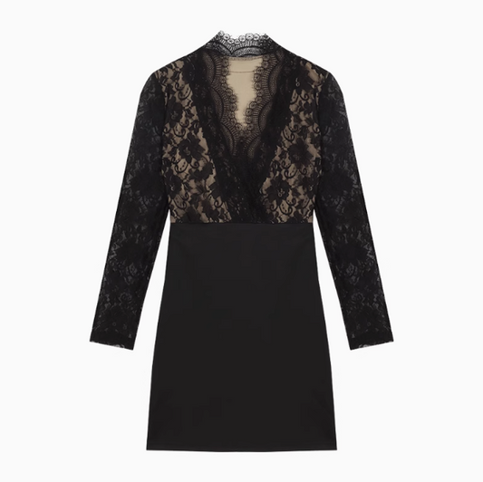 Lace patchwork long sleeve v-neck tight hip dress ED0874