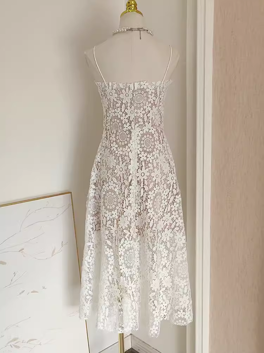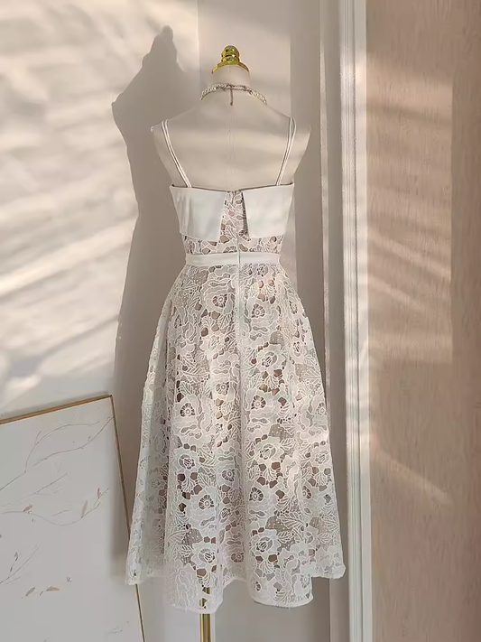 Cute A line Spaghetti Straps Lace Vacation Dress White Women Dresses SD152
