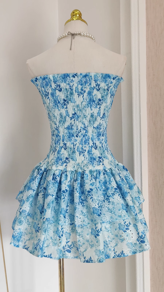 Cute A line Strapless Sleeveless Blue Floral Party Dress Short Birthday Outfits SD380