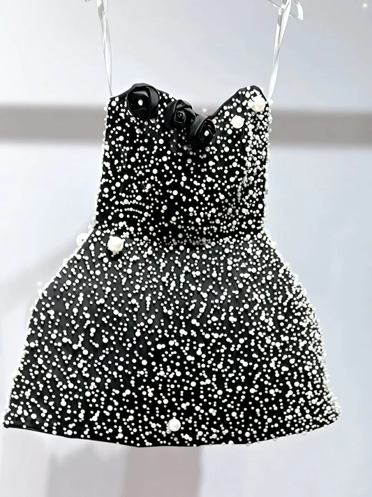 Gorgeous Strapless Black Satin Pearls Mini Birthday Outfits A Line Homecoming Dress S407