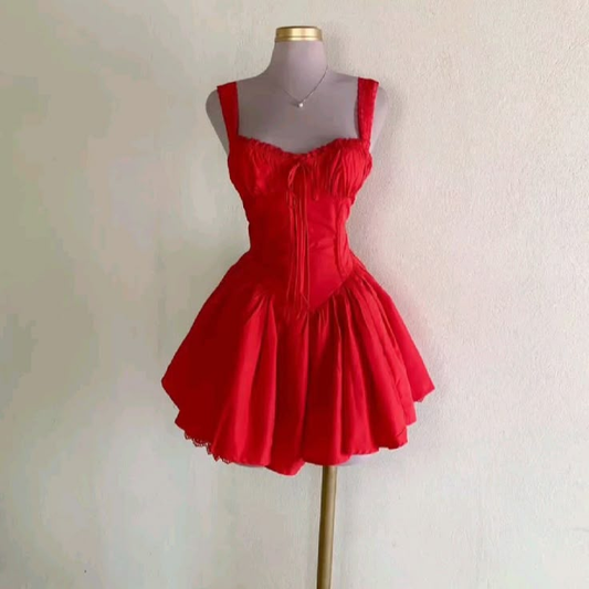 Vintage Strapless Red Satin Pleated Cocktail Dress Short Homecoming Dress Birthday Outfits S776