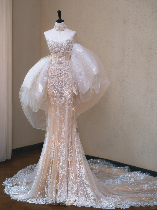 Classy Champagne Strapless Tulle Lace Appliques Mermaid Long Wedding Dress Bridal Dress S911