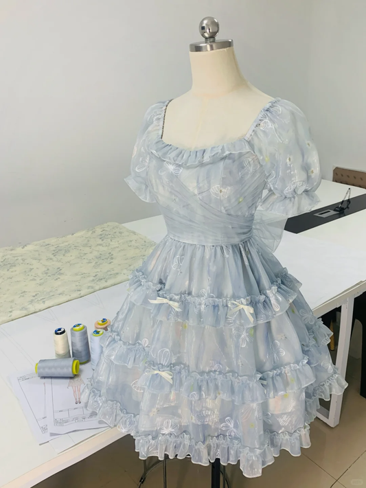 Cute Blue Square Neck Chiffon Print Floral Ruffles A Line Homeocming Dress Princess Bithday Outfits S903