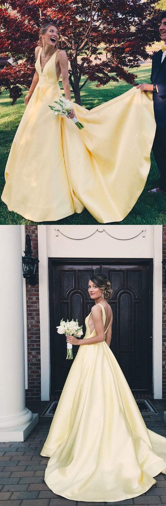 Sexy V Neck Yellow Satin A Line Long Prom Dresses, Backless Formal Dresses cg404