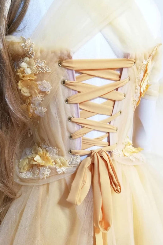 Yellow tulle lace long prom dress A line evening gown SA1293
