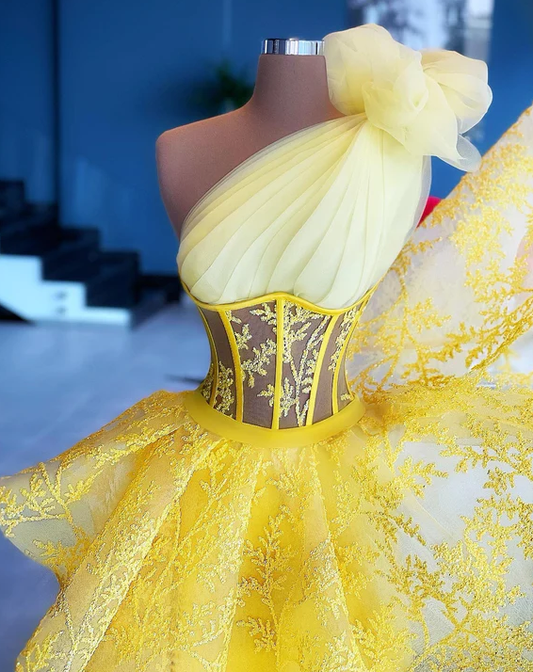 Yellow Gorgeous One Shoulder Mermaid Prom Dresses with Ruffle fg1938