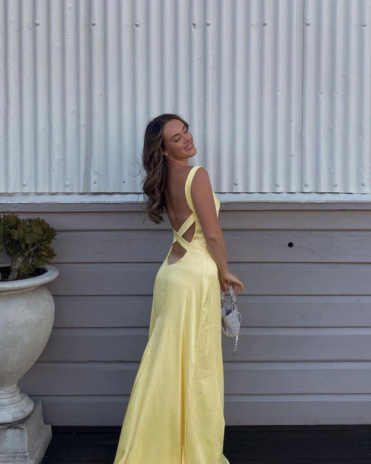 Simple Straps Yellow Backless Long Prom Dress fg5318