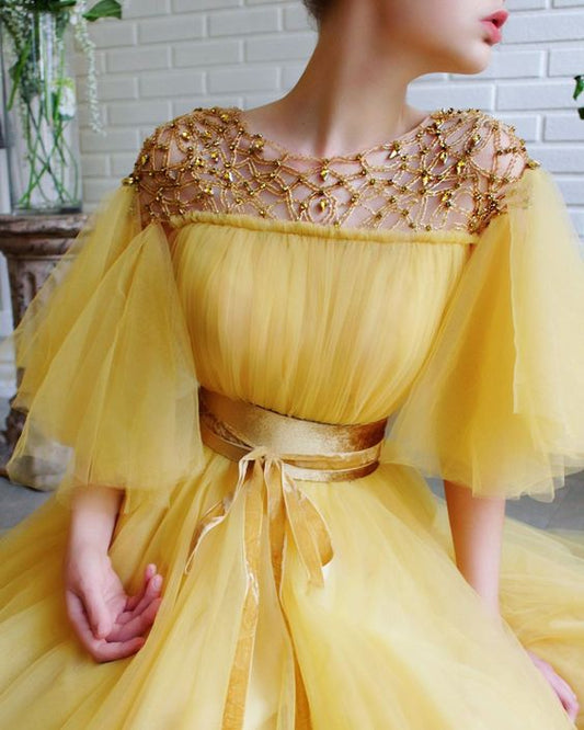 modest yellow prom dress long prom dresses wit tulle evening gown B613