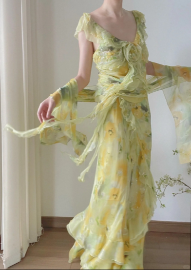 Mermaid Floor Length Yellow Prom Dress With Ruffles 22th Birthday Outfit P1388