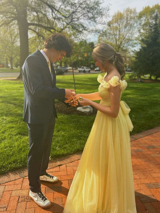 Off the shoulder 3D flower prom dress a line yellow gown gh2781