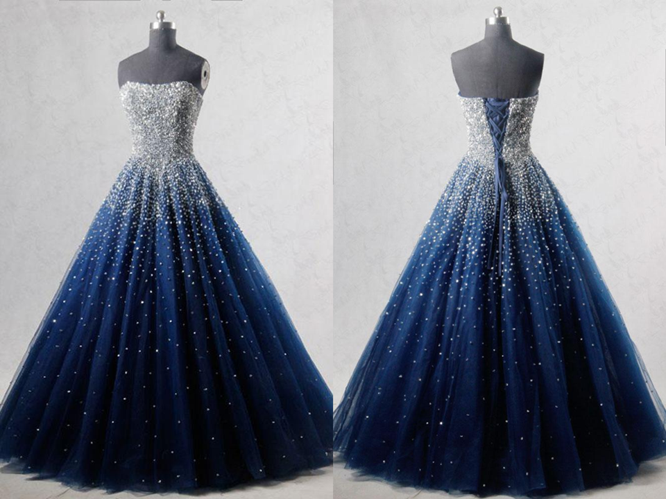 Navy Blue Strapless Floor Length Prom Ball Gown with Beading Sequins, Prom Dresses,Formal Dresses