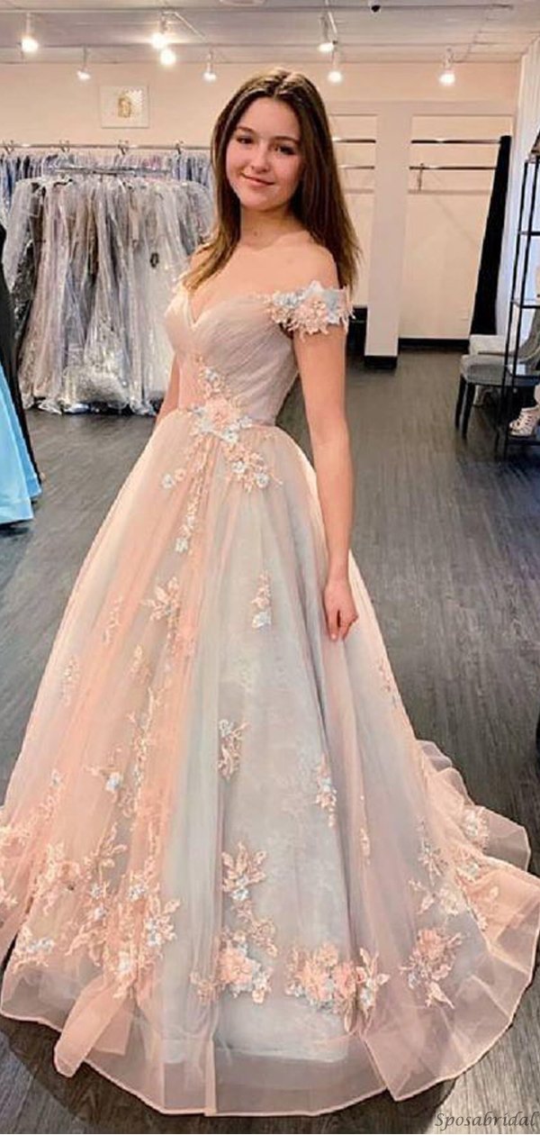 Elegant Pink Blue Off-shoulder Floral A-line Long Prom Dress