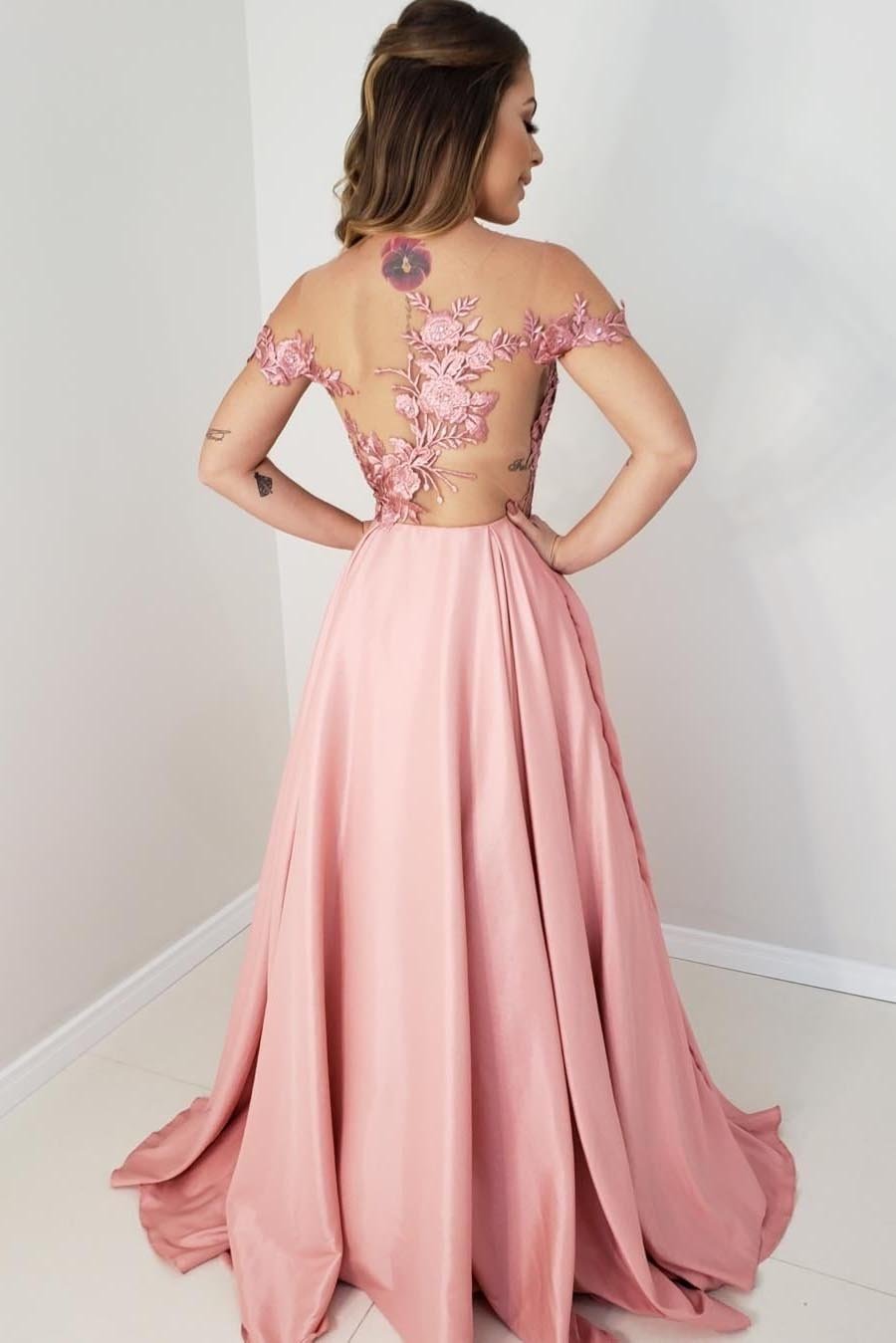 Off Shoulder Appliques Satin Long Prom Dress,Formal Dresses Pink Formal Gown