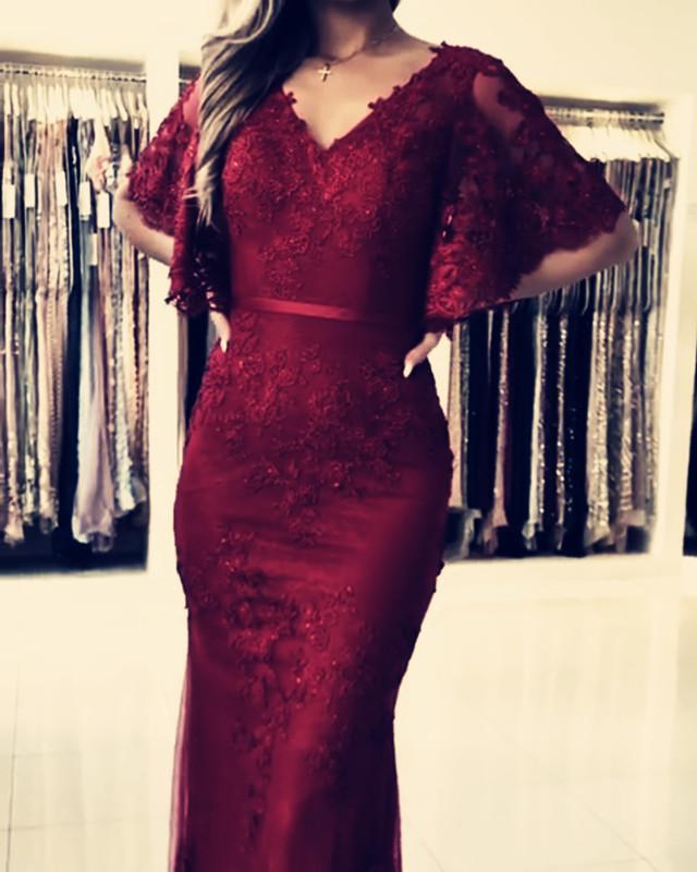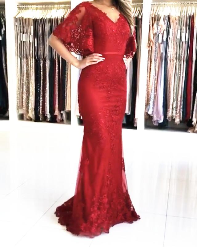 Modest Prom Dresses Lace Mermaid Evening Gown With Puffy Sleeves